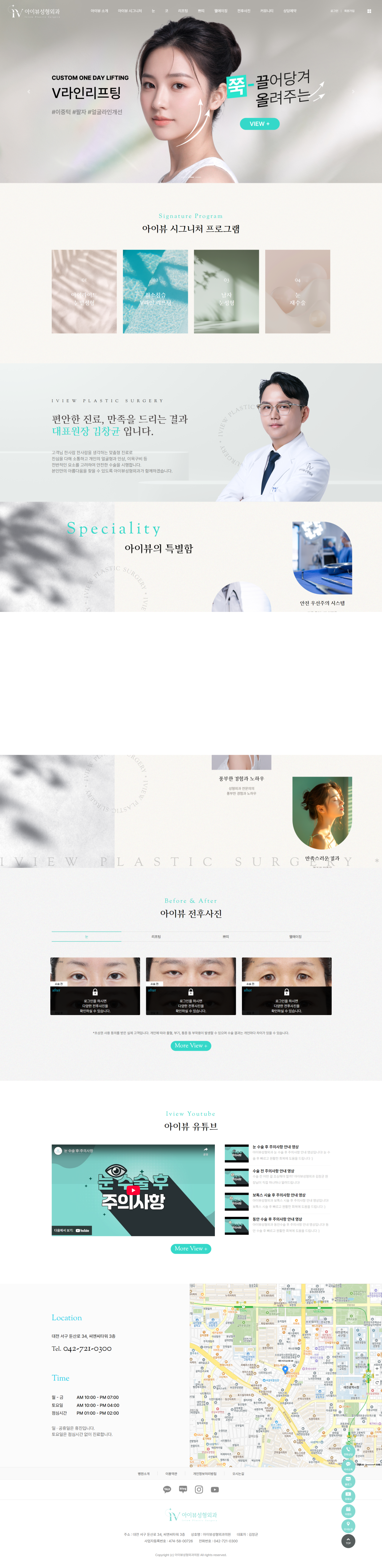 아이뷰성형외과의 성형외과홍보사이트로 아이뷰 소개, 아이뷰 시그니처, 눈 리프팅, 쁘띠, 웰메이징, 전후사진, 커뮤니티, 상담예약 메뉴로 구성되어 있으며, 디바이스 디스플레이의 종류에 따라 화면의 크기가 자동으로 변화하는 반응형 웹으로 구현하여 웹사이트의 이용편의성을 높였습니다.