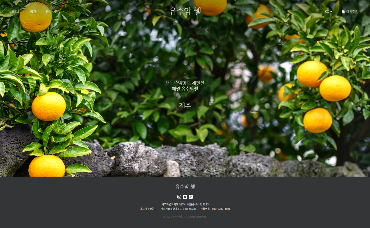 유럽풍 단독주택형 독채펜션 애월 유수암쉘의 펜션 홍보사이트로 스토리, 공간, 공지사항, 예약하기 메뉴로 구성되어 있으며, 디바이스 디스플레이의 종류에 따라 화면의 크기가 자동으로 변화하는 반응형 웹으로 구현하여 웹사이트의 이용편의성을 높였습니다.